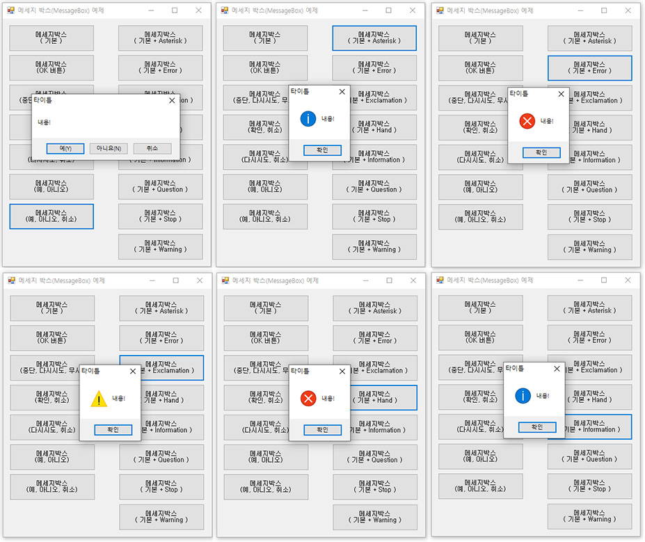 MessageBox.Show("내용!", "타이틀", MessageBoxButtons.OK, MessageBoxIcon.Information); // 메세지 박스 - 버튼(기본) + 아이콘 (Information)