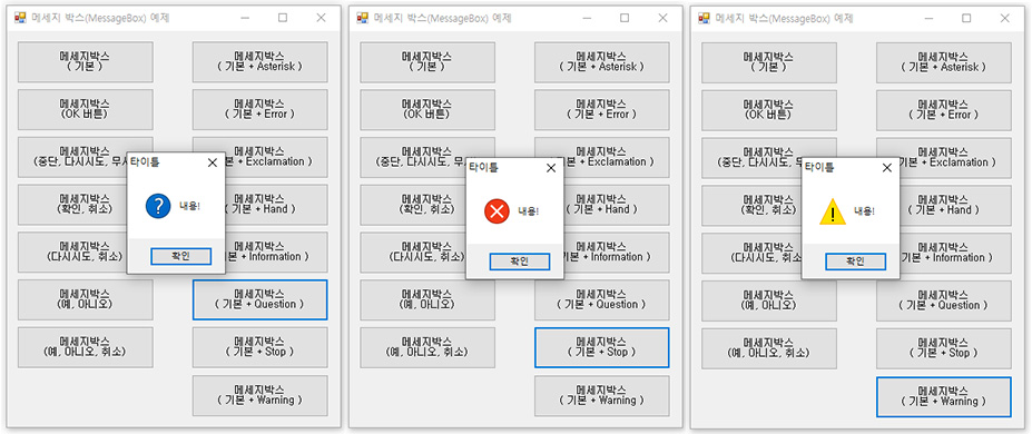 MessageBox.Show("내용!", "타이틀", MessageBoxButtons.OK, MessageBoxIcon.Question); // 메세지 박스 - 버튼(기본) + 아이콘 (Question)